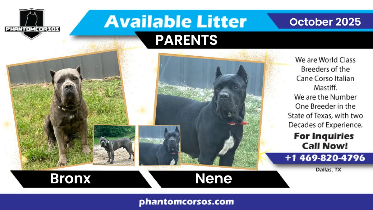 Welcome to Phantom Corsos, where we are passionate about the Cane Corso Italian Mastiff breed and making families happy! Our love for this exceptional breed has inspired us to become elite Cane Corso breeders in Texas, dedicated to producing puppies that are happy, healthy, and thriving. Although this breed is known for its imposing presence and dominant nature, with the best care, love, and training, they make the perfect addition to any family.